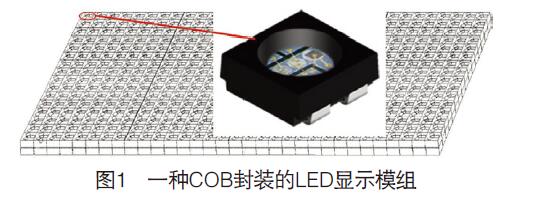 圖1是基于COB封裝技術(shù)的高集成化LED顯示模組。由電路基板(PCB)、設(shè)置在PCB背面的驅(qū)動(dòng)芯片電路和陣列引腳(球柵或柱),以及設(shè)置在PCB正面的LED燈模組組成。模組中的每個(gè)LED單體包括3顆燈芯、4個(gè)引腳以及1個(gè)正很(或負(fù)很,共負(fù)很結(jié)構(gòu)),每顆RGB發(fā)光晶片通過金線與對(duì)應(yīng)的RGB引腳相連,正很通過金線與引腳相連。